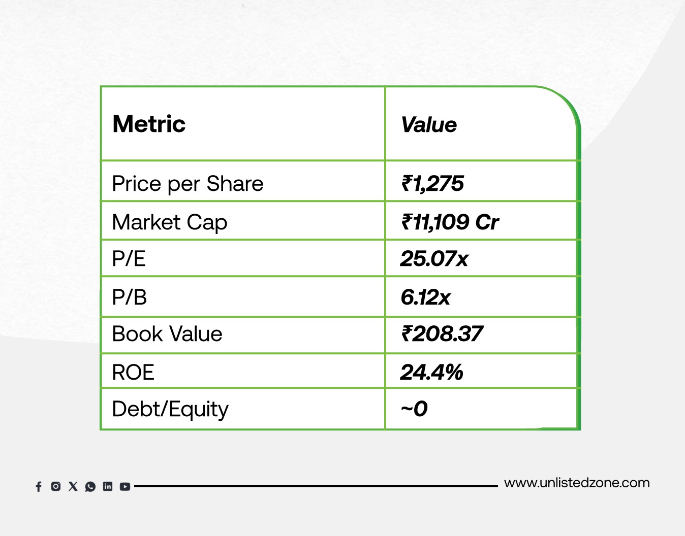 At ₹1,275/share, valuations appear fair (P/E ~25x, in line with listed peers).