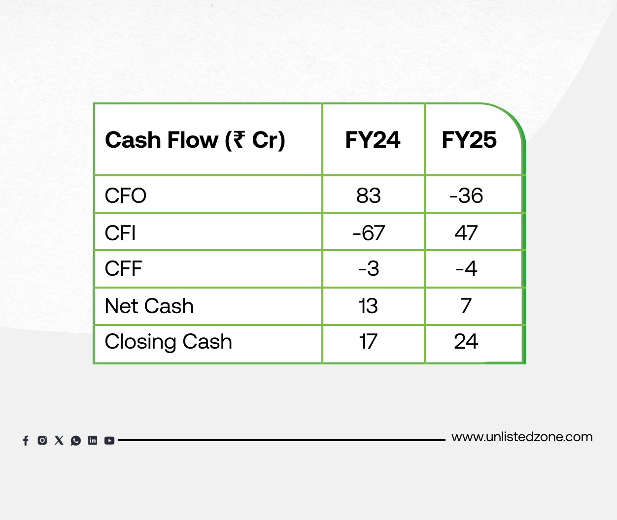 Closing Cash remained adequate at ₹24 Cr in FY25, but the volatility in CFO requires monitoring.