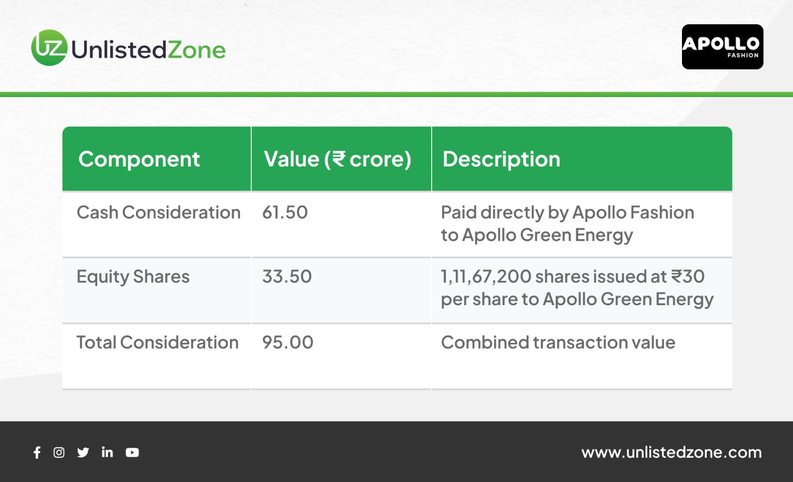 The share allotment on February 14, 2025, gave Apollo Green Energy a 37.52% equity stake in Apollo Fashion, ensuring continued strategic alignment.