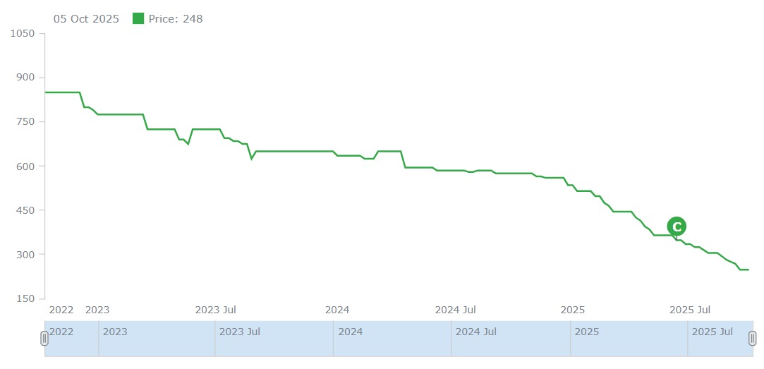 📉 As per data from UnlistedZone, the stock has fallen from around ₹825 in 2022 to just ₹248 as of October 2025, wiping out significant investor wealth.