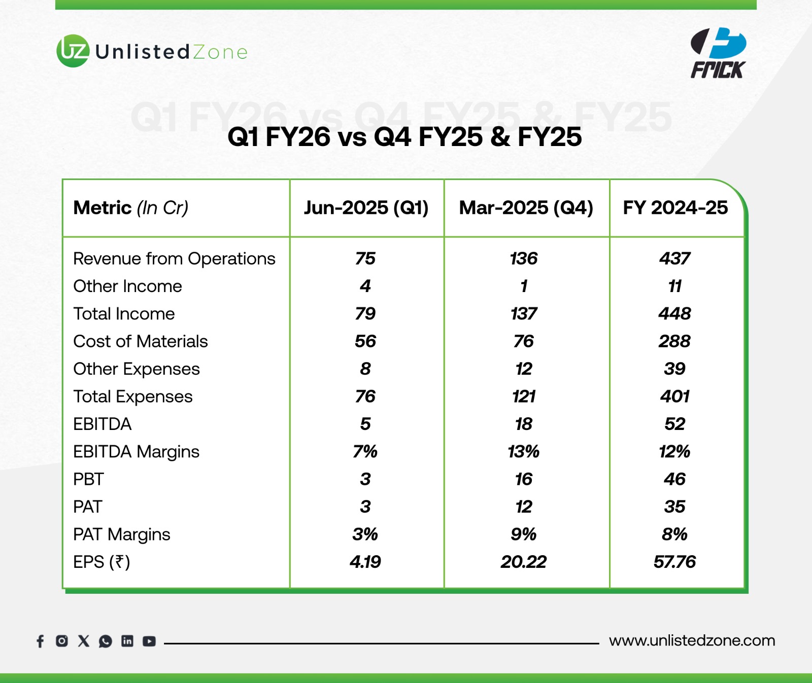 Revenue saw a significant decline from ₹136 Cr in Q4 FY25 to ₹75 Cr in Q1 FY26, reflecting seasonality and softer demand in the opening quarter.