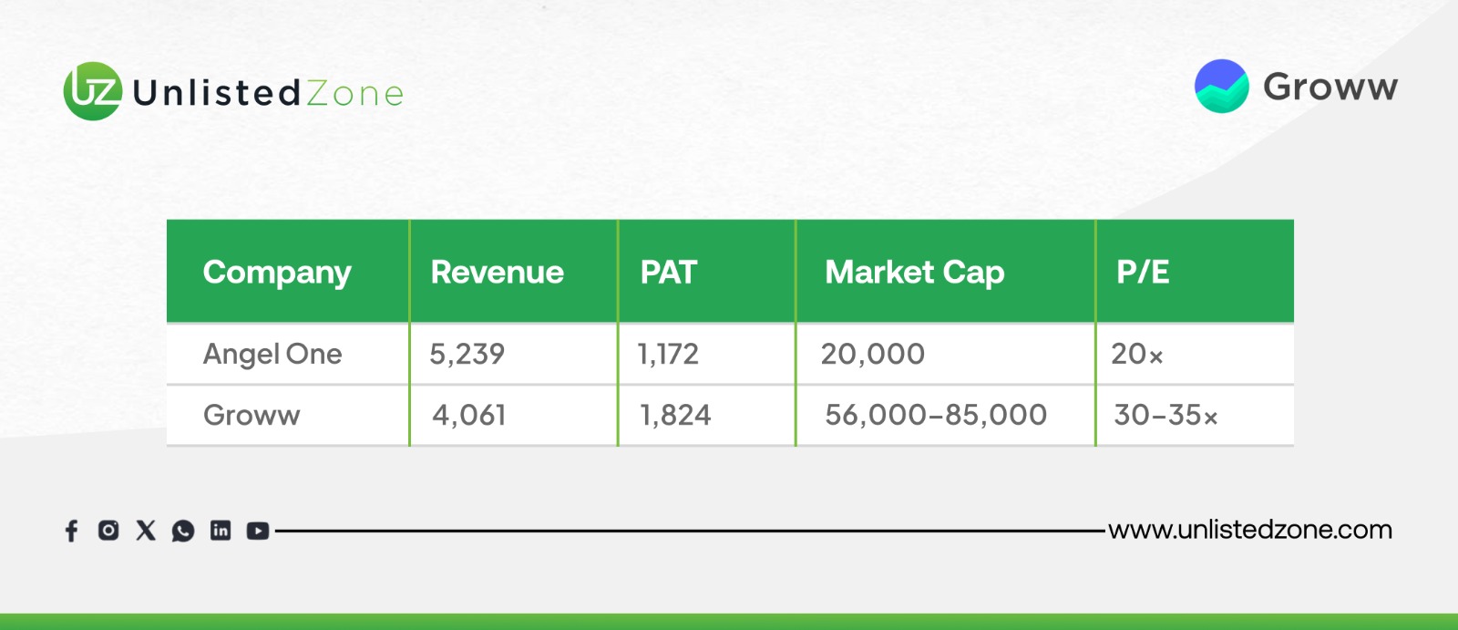 Despite lower revenue than Angel One, Groww commands a premium valuation due to higher profitability, rapid growth, and strong brand equity.