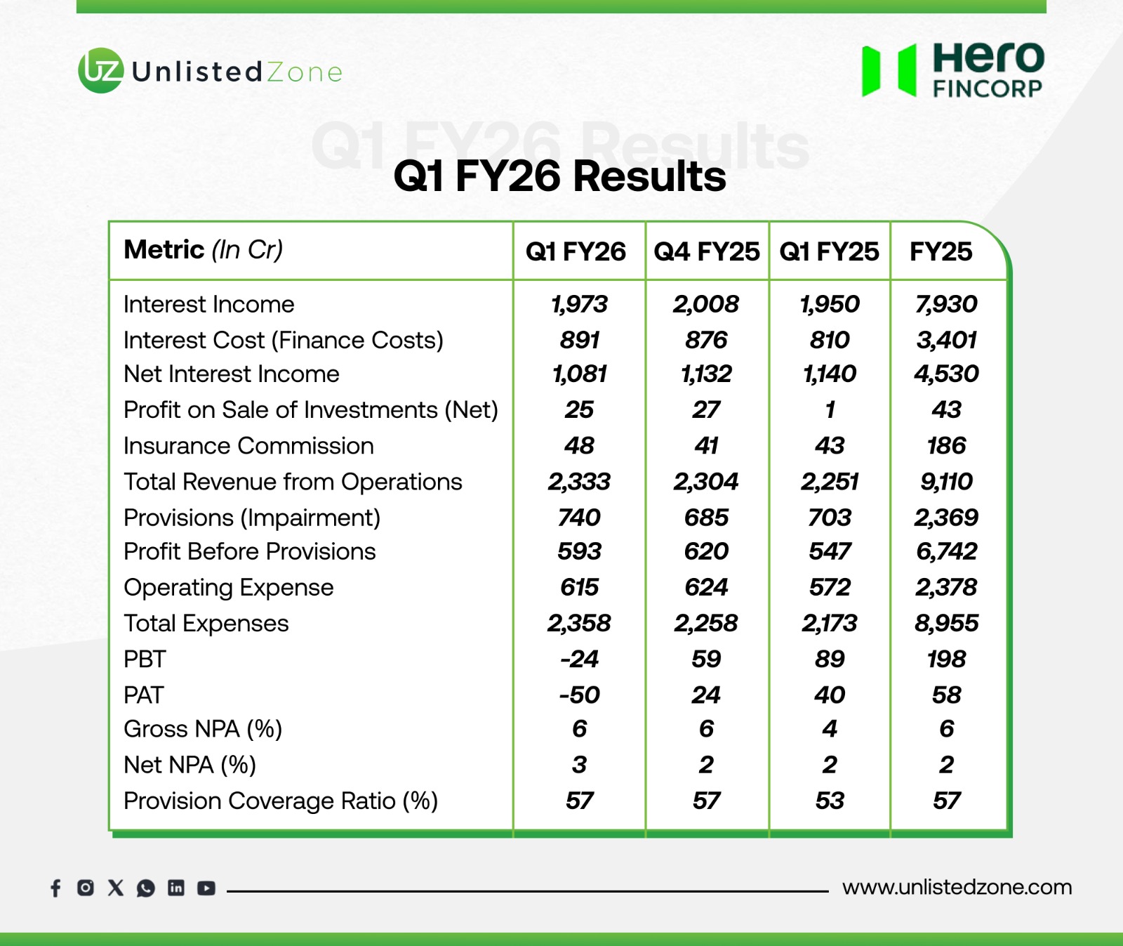 Hero FinCorp’s Q1 FY26 results indicate resilient revenue growth but significant profitability headwinds due to elevated credit provisions and slightly deteriorating asset quality. While its diversified lending base provides stability, the focus ahead will be on controlling credit costs and improving recoveries to restore margins.