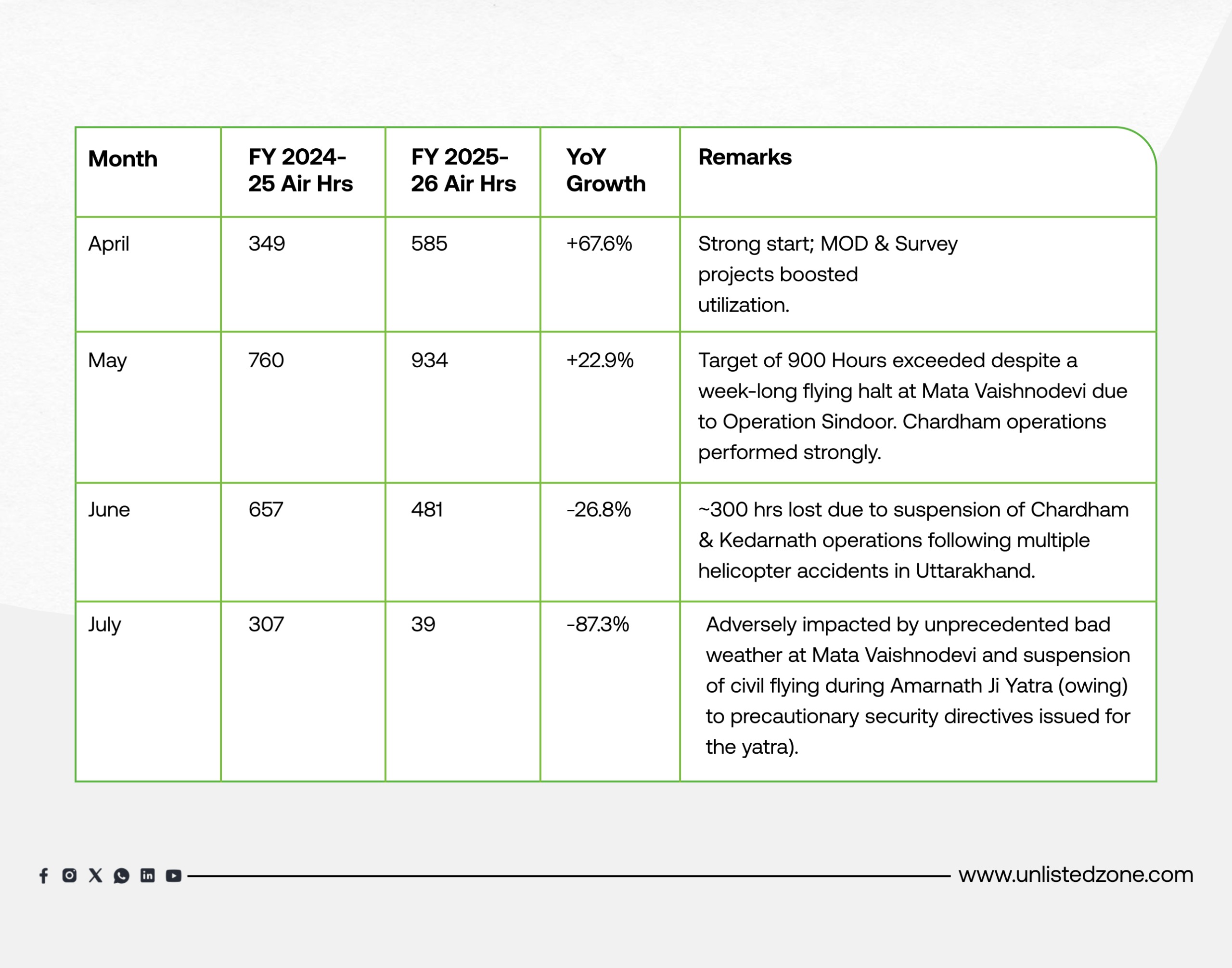 June 2025: 481 air hours (–26.8% YoY) – Nearly 300 hours lost after suspension of Chardham & Kedarnath flying due to helicopter accidents in Uttarakhand.