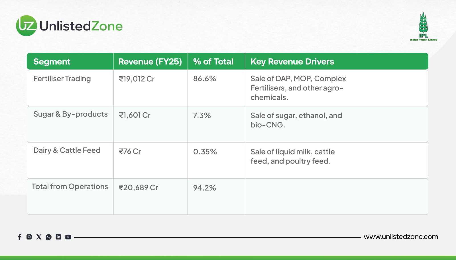 IPL's revenue is diversified across its business segments, with the core fertiliser business contributing the bulk of the turnover, while other segments and non-operational income drive profitability.