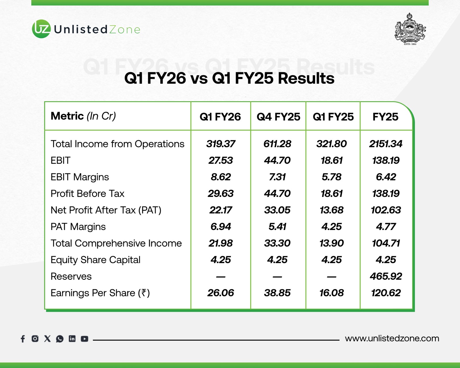 The company reported total income from operations of ₹319.36 Crore, a slight drop of 0.76% compared to ₹321.80 Crore in Q1 FY25. This indicates resilience in maintaining sales volumes despite seasonal variations in demand.