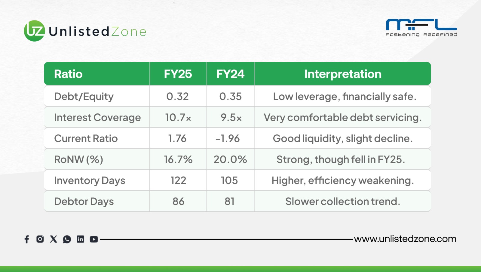 Mohindra Fasteners Limited is a financially stable, moderately growing, and strategically agile company in the high-tensile fastener industry. Despite FY25 revenue and profit pressures, MFL has maintained healthy profitability, low debt, and consistent shareholder returns.