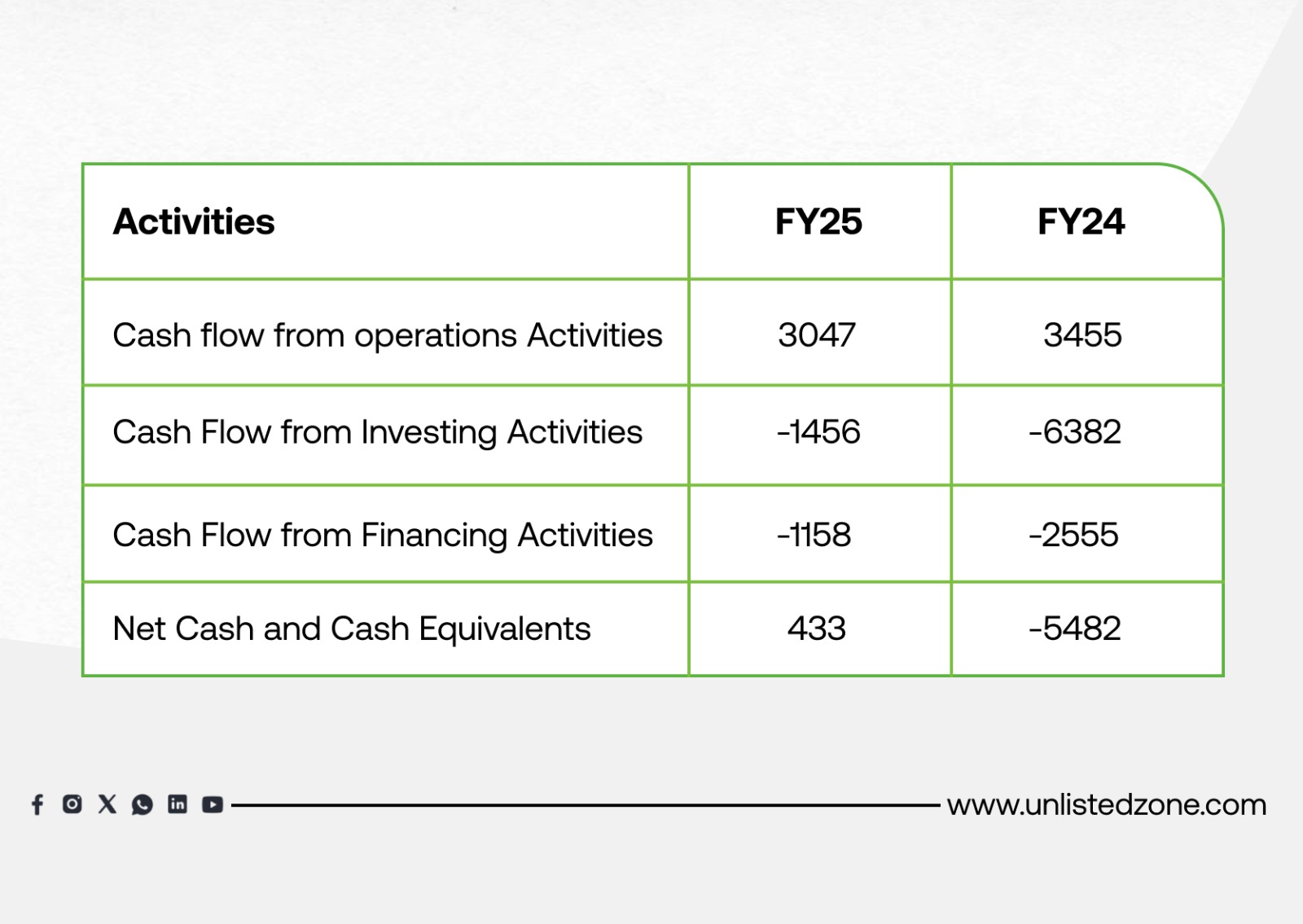 Positive operational cash flow declined slightly YoY, indicating stable but pressured core operations. Investing outflows reduced (less capex), while financing outflows eased. Net positive in FY25 vs. negative in FY24, showing improved liquidity.