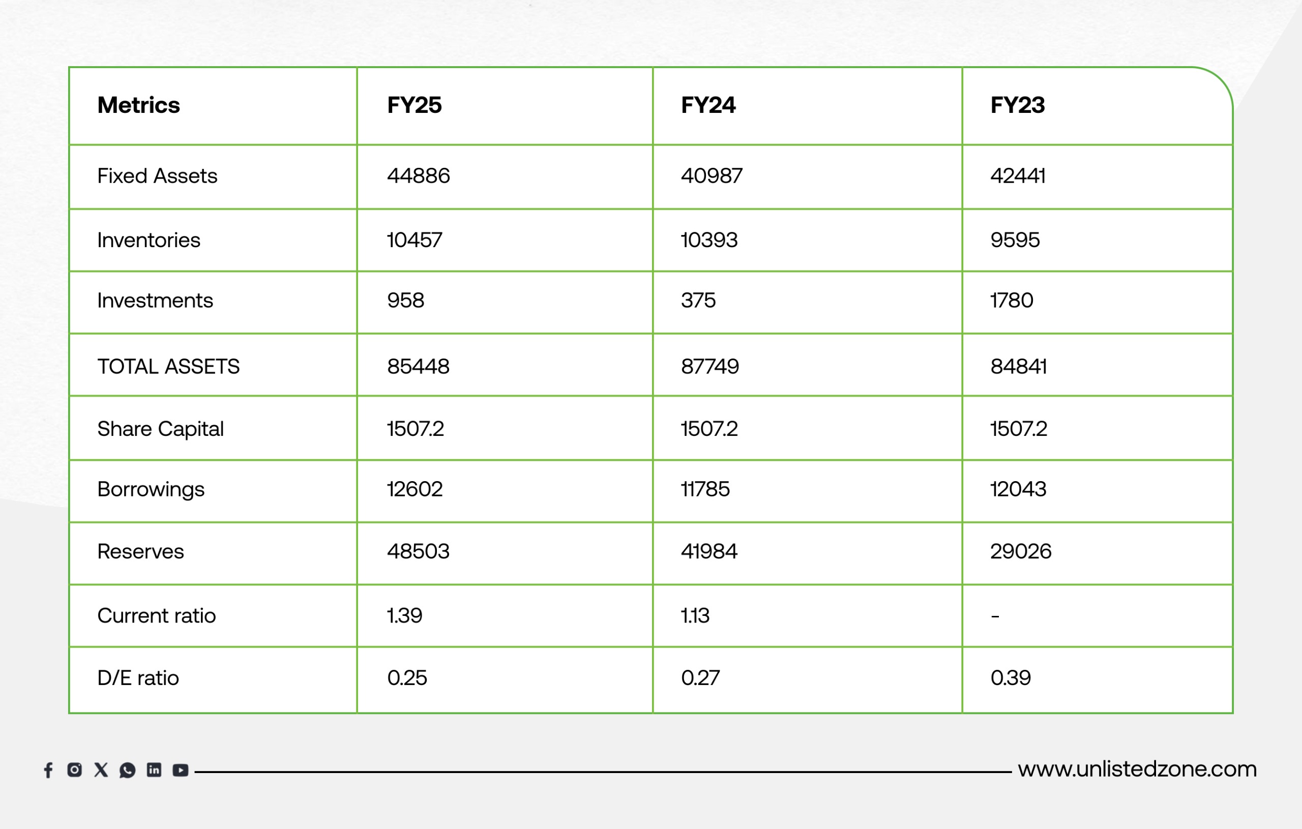 Assets, Liabilities, and Equity Changes: Total assets dipped 2.6% YoY to ₹85,448 Cr, driven by lower investments; fixed assets rose 9.5% due to expansions. Borrowings increased 7.0%, but reserves grew 15.5%, boosting net worth.
