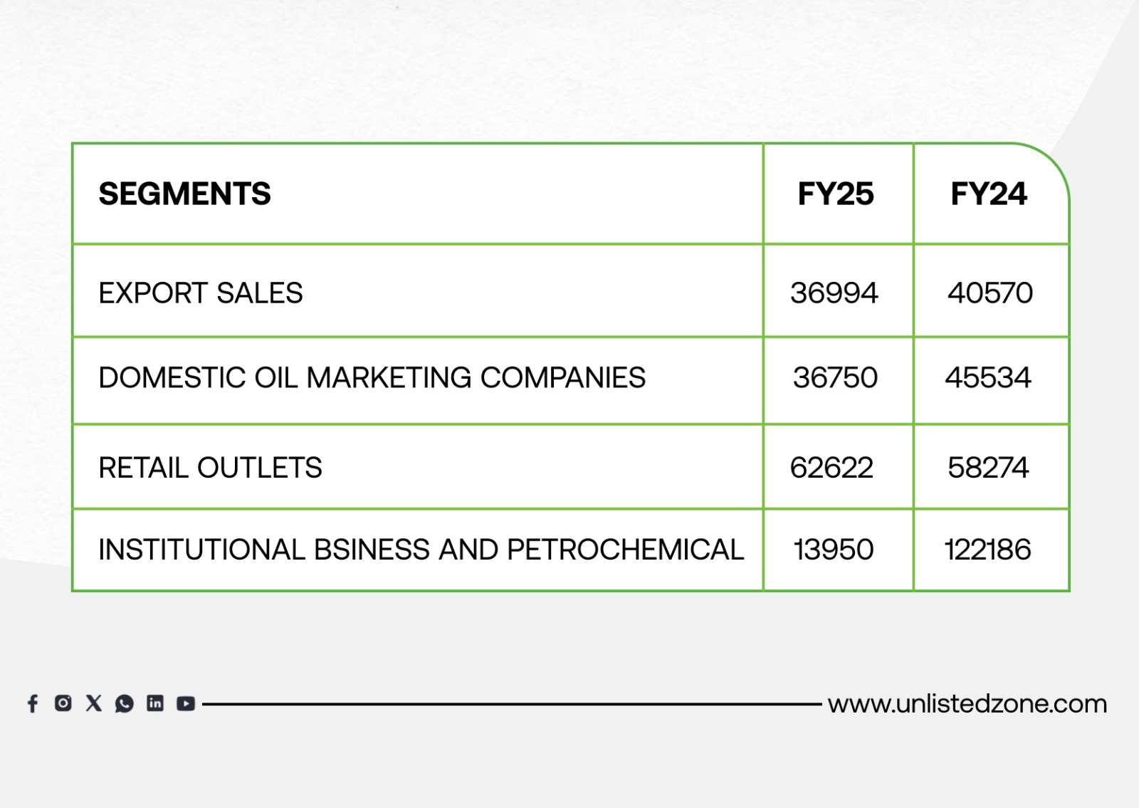 Regional or Product-Level Performance: Domestic segments (retail + oil companies + institutional) total ~74% of sales, up from FY24 mix. Retail strength aligns with 6,683 outlets; petrochemicals leverage 8% national capacity.