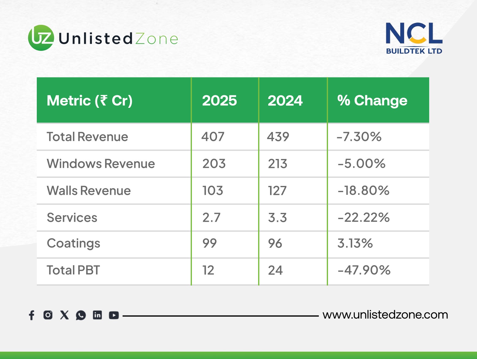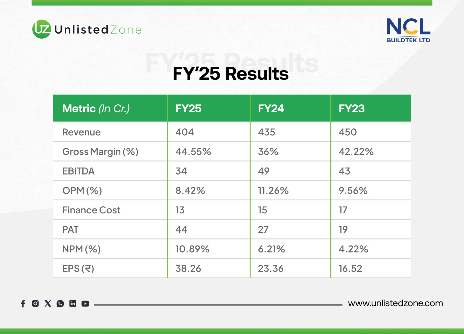 NCL Buildtek faced a challenging FY2025 with revenue down 7% due to market headwinds impacting key segments. However, strong cost control, reduced debt, and a one-time gain drove a 63% surge in profit to ₹44 Cr. The company strengthened its balance sheet, boosting cash reserves to ₹59 Cr, and successfully grew new verticals like Aluminium (+125%). Financially robust and trading at reasonable valuations, it is positioned for recovery, making it a compelling option for long-term investors.