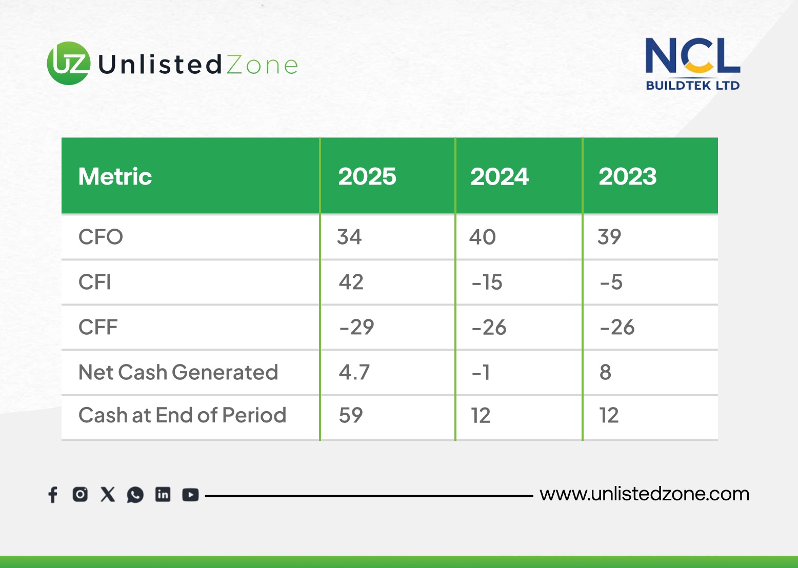 Cash Flow from Operations (CFO) remained strong and consistent (₹39-40 Cr) in FY23 and FY24.