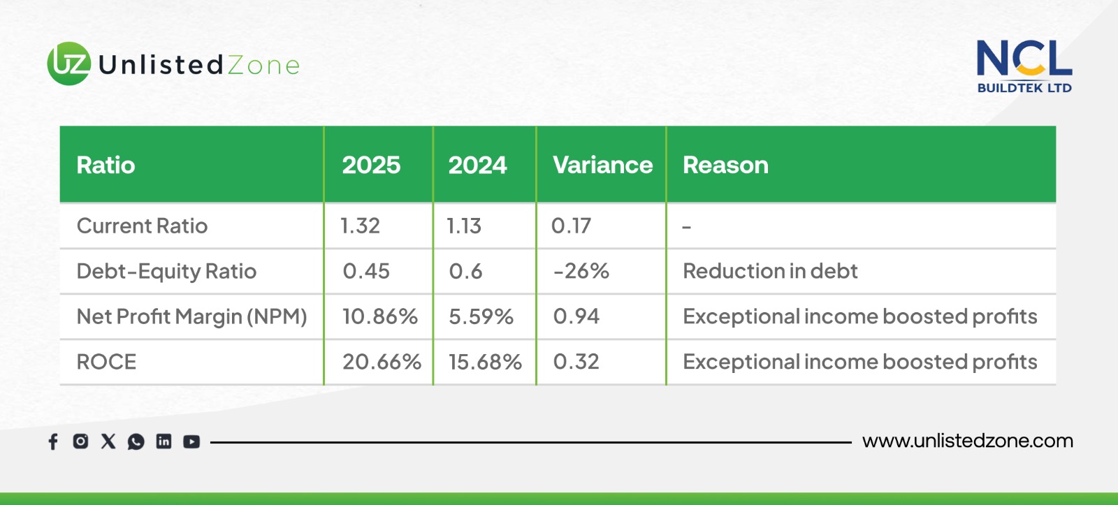 Bottom-Line Strength: Despite operational challenges, Net Profit (PAT) more than doubled in two years (₹19Cr → ₹44Cr), and Net Profit Margin (NPM) hit 10.89%, primarily due to a large, one-off ₹48Cr other income.