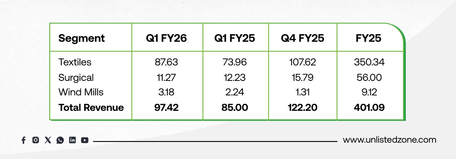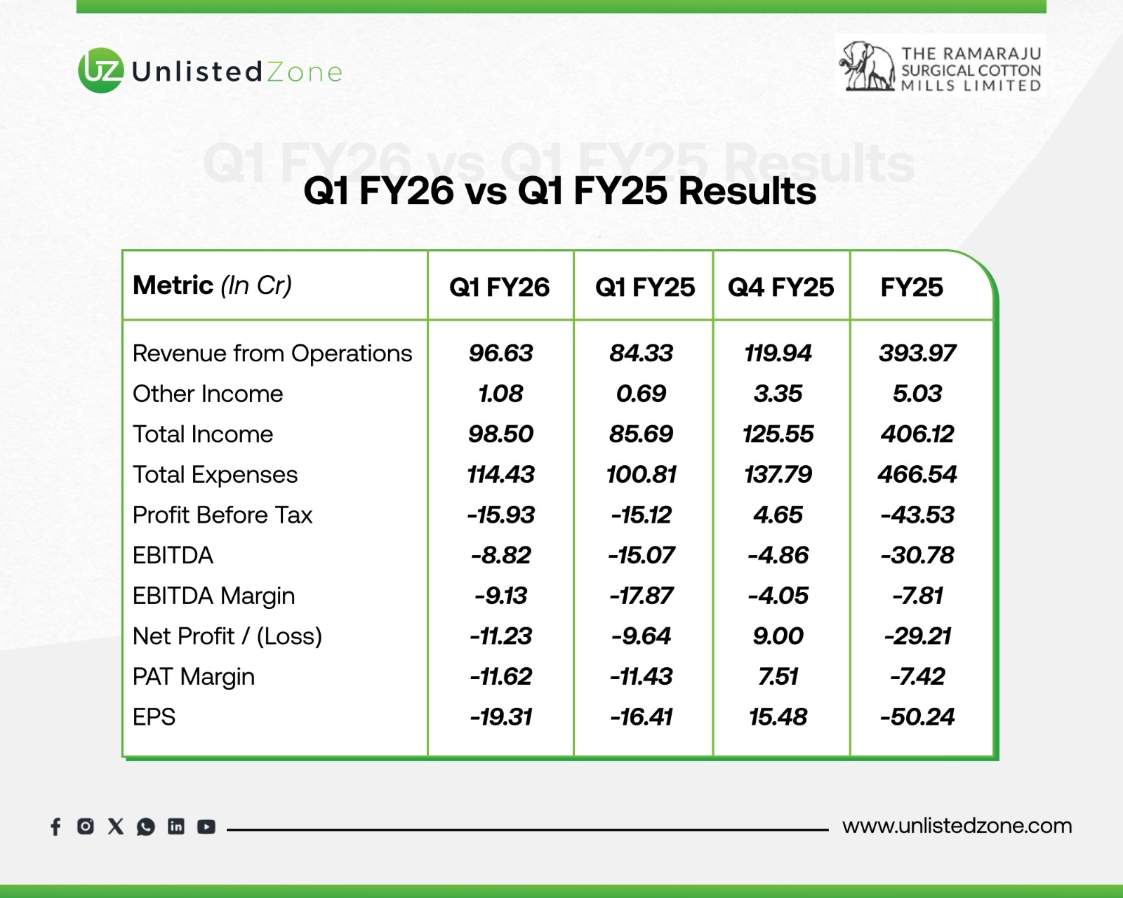 Ramaraju Surgical Cotton Mills Limited, part of the renowned Ramco Group, has released its Q1 FY26 (June 2025) financial results, offering a detailed view of the company’s performance across segments. Known for absorbent cotton, surgical products, and premium cotton yarn, the company delivered strong revenue growth but continues to face profitability challenges.