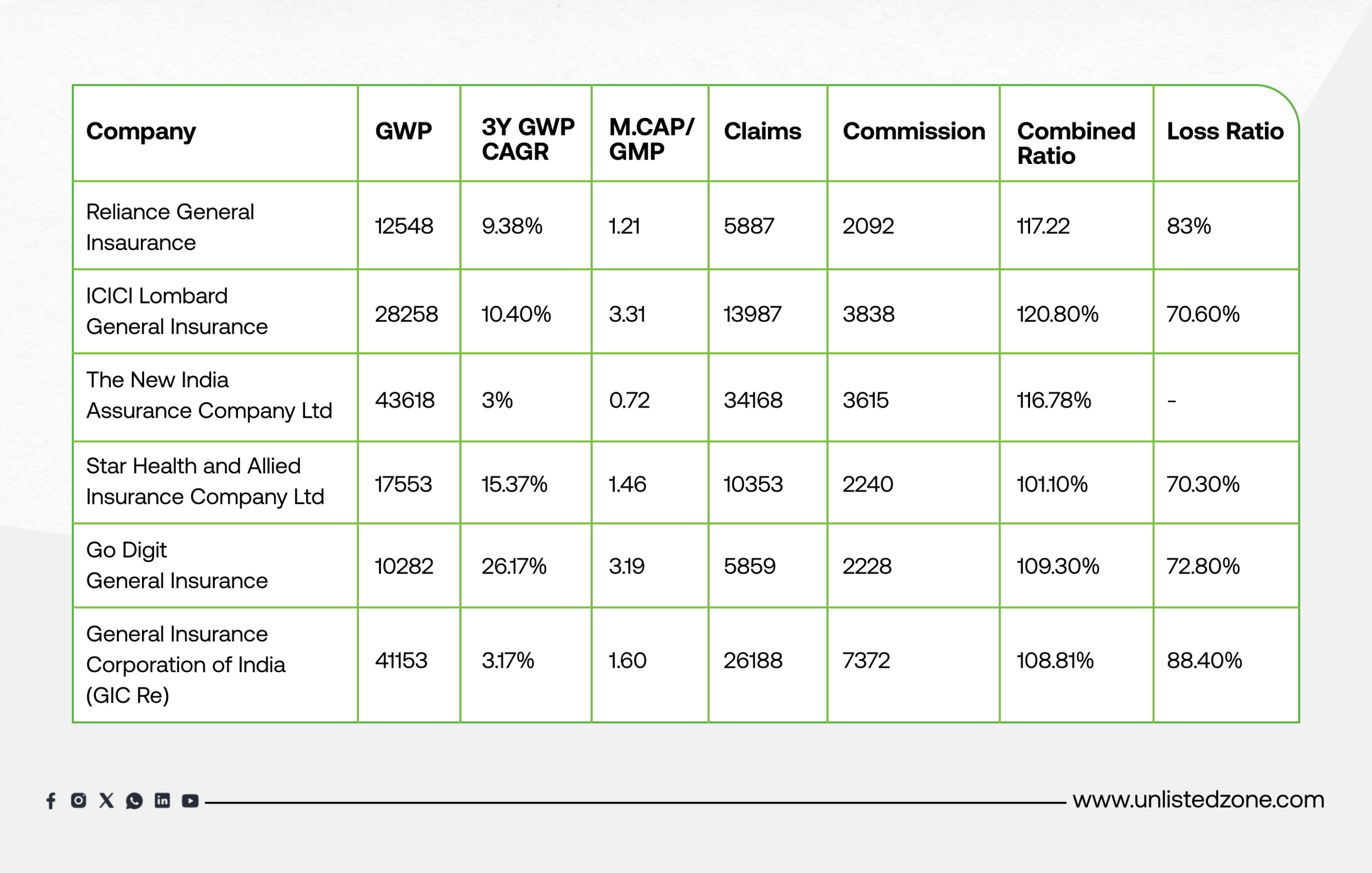 Reliance General Insurance: Mid-sized player, but weaker underwriting and high loss ratio keep valuations subdued.