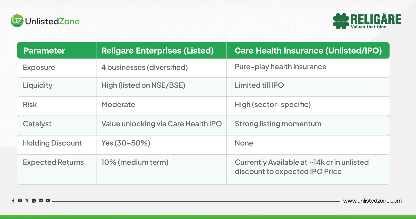 Parameter Religare Enterprises (Listed) Care Health Insurance (Unlisted/IPO) Exposure 4 businesses (diversified) Pure-play health insurance Liquidity High (listed on NSE/BSE) Limited till IPO Risk Moderate High (sector-specific) Catalyst Value unlocking via Care Health IPO Strong listing momentum Holding Discount Yes (30–50%) None Expected Returns 10% (medium term) Currently Available at ~14k cr in unlisted discount to expected IPO Price