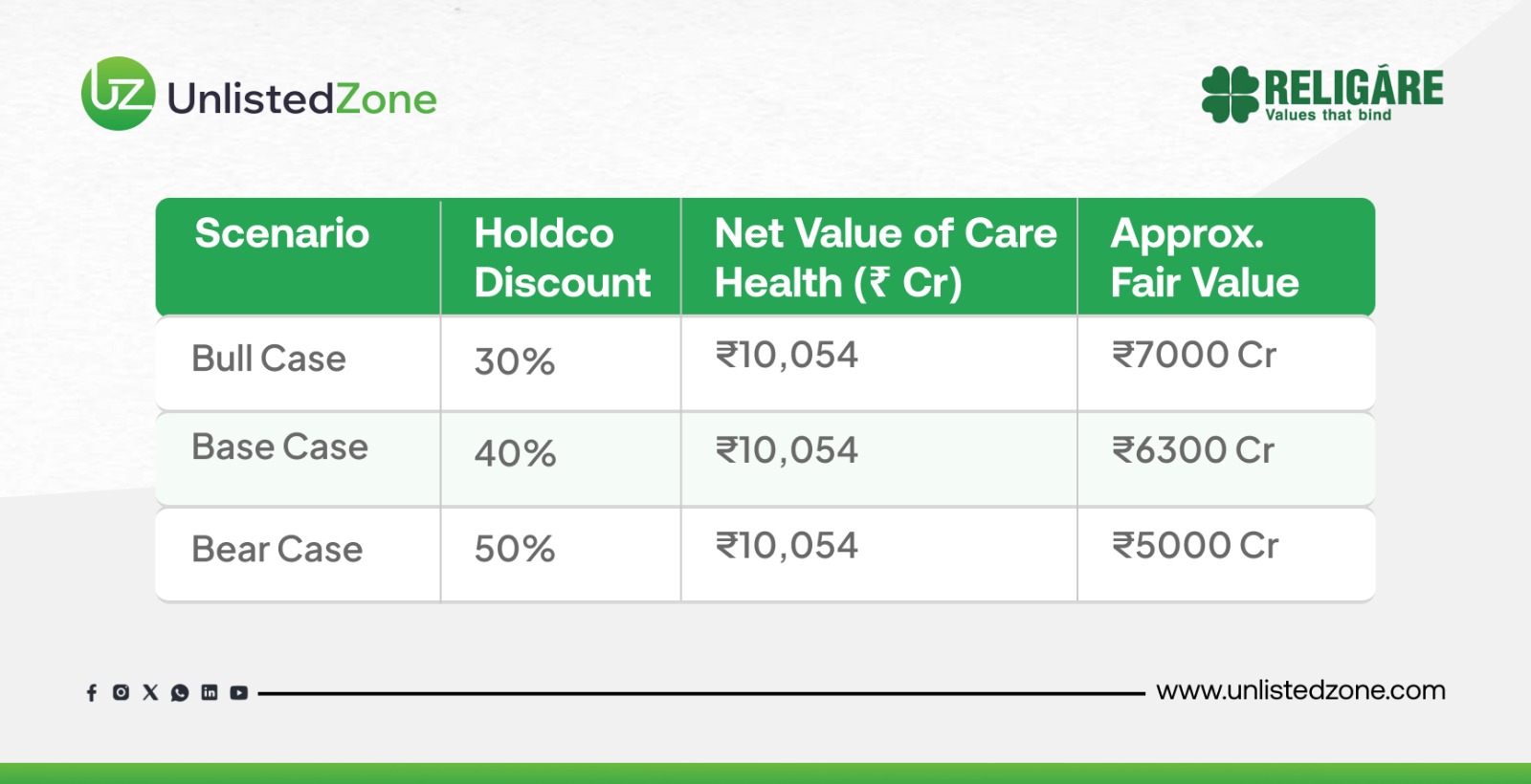 Holding companies typically trade at a 30–50% discount in India due to structural inefficiencies, taxation, and governance factors. Applying this to Religare’s Care Health business at INR 10,054 Cr as calculated above gives the following range: