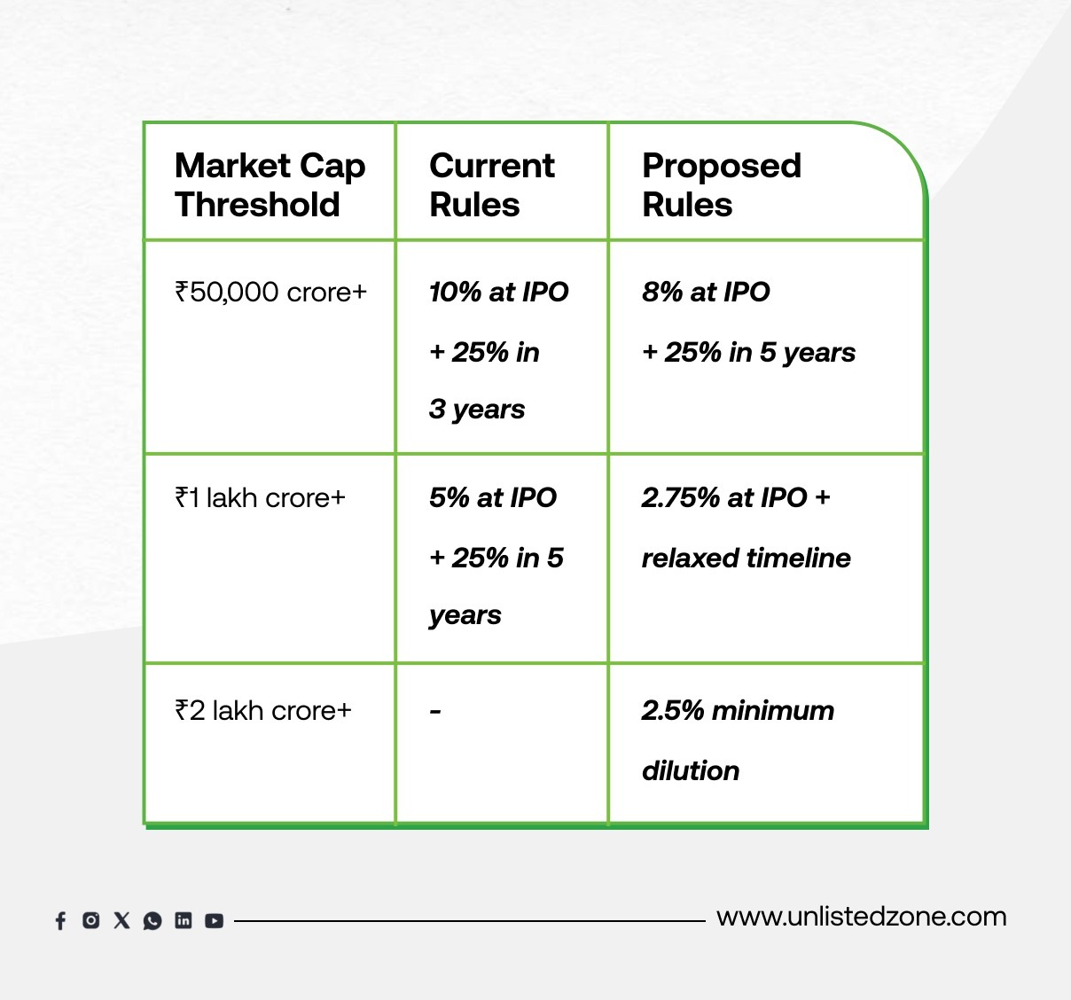 • ₹1 lakh crore+ companies: Dilution requirement reduced from 5–6% to 2.75%.