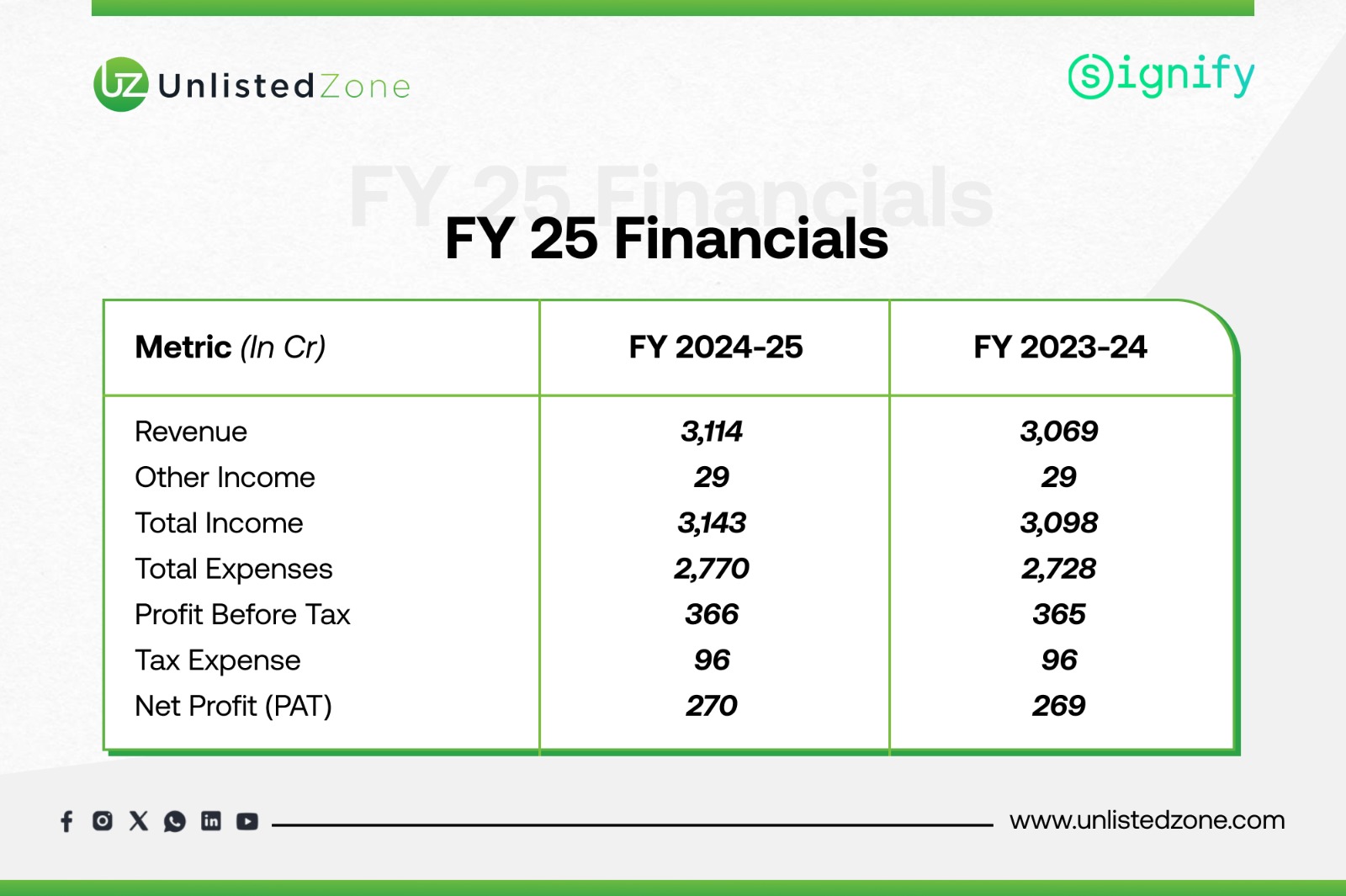 Signify Innovations India Limited delivered a steady FY25 performance with stable revenue, resilient profitability, and strong returns on capital. The company’s ability to maintain PAT at ₹270 crore despite higher input costs demonstrates effective cost management. Cash flows from operations remain strong, though aggressive dividend payouts and liabilities management have reduced reserves.