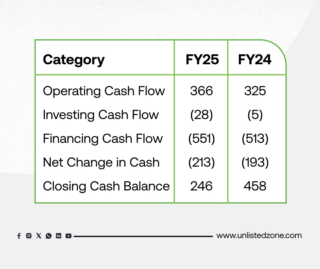 Cash Reserves dropped significantly from ₹458 crore to ₹362 crore, indicating higher outflows despite strong operating cash generation.