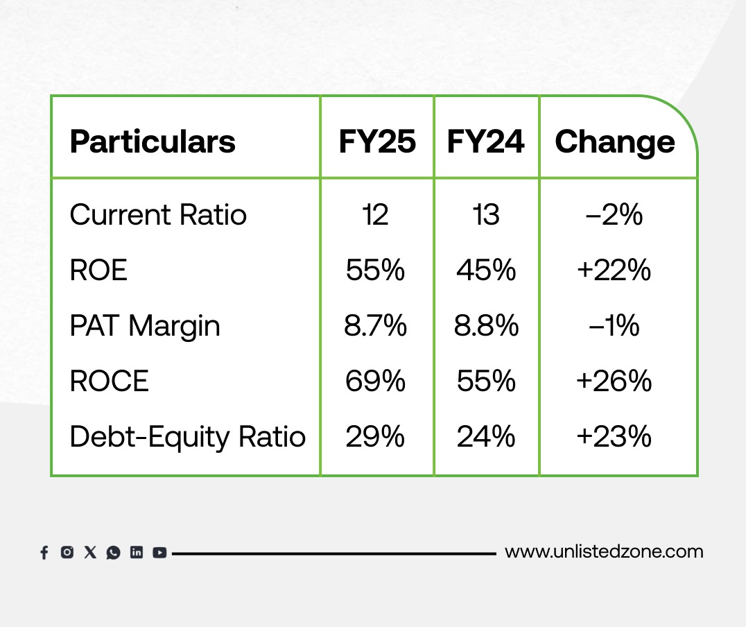 Margins were well managed, with PAT margins at 8.7%, only marginally lower than last year’s 8.8%. This demonstrates consistent operational efficiency.