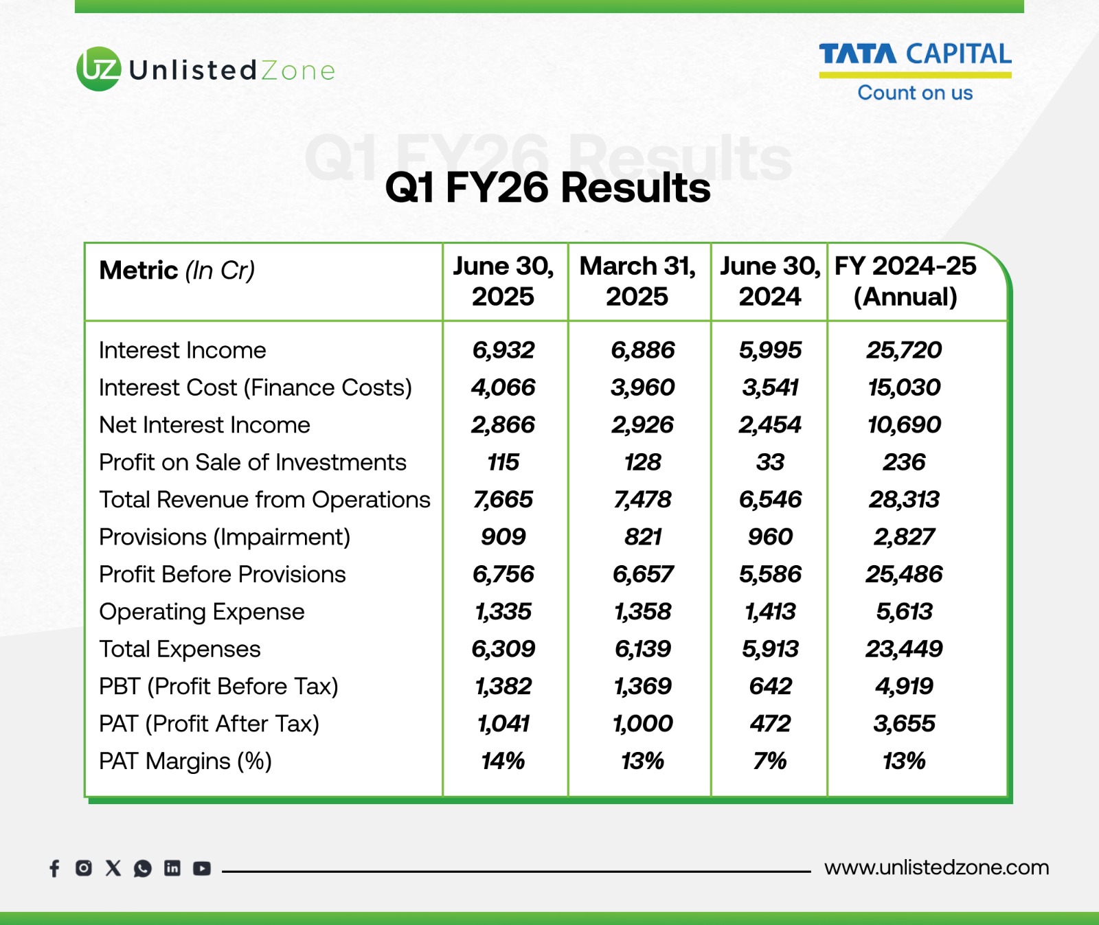 Tata Capital has delivered a robust performance in the first quarter of FY26, reflecting steady loan growth, efficient cost management, and strong profitability. Below is a snapshot of the company’s financials: