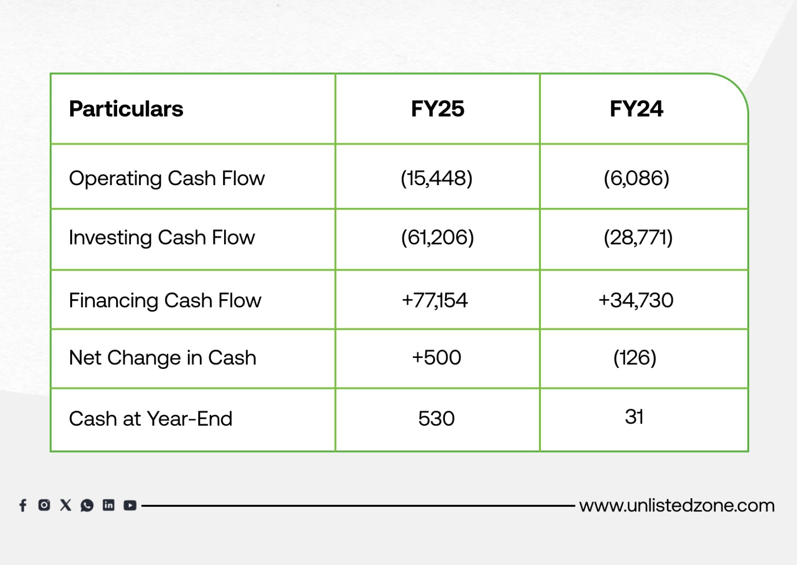 Liquidity Boost: Cash reserves increased from ₹30.63 Lakhs to ₹530.38 Lakhs, despite heavy cash burn.